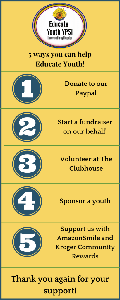 - Make a cash contribution via PayPal or Contact Us to give a different way. As the saying goes, any amount will help to support Educate Youth. You can designate how you want the funds to be used, or you may make a no-strings-attached donation. The no-strings-attached option will allow the executive director to spend the money in the best interest of the organization.