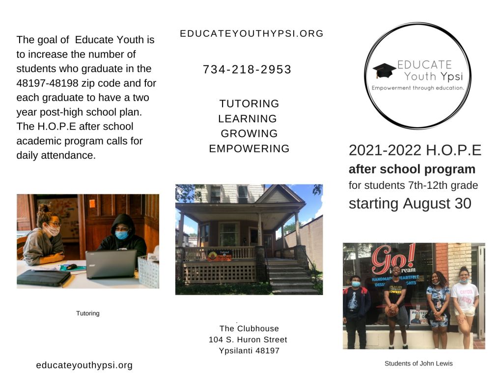 Having Opportunities for Positive Education (H.O.P.E.) is a program for youth ages 13-17 that provides support for improvement in academic performance, personal responsibility and life skills. Our main focus is on increasing academic performance in 100% of our youth.
