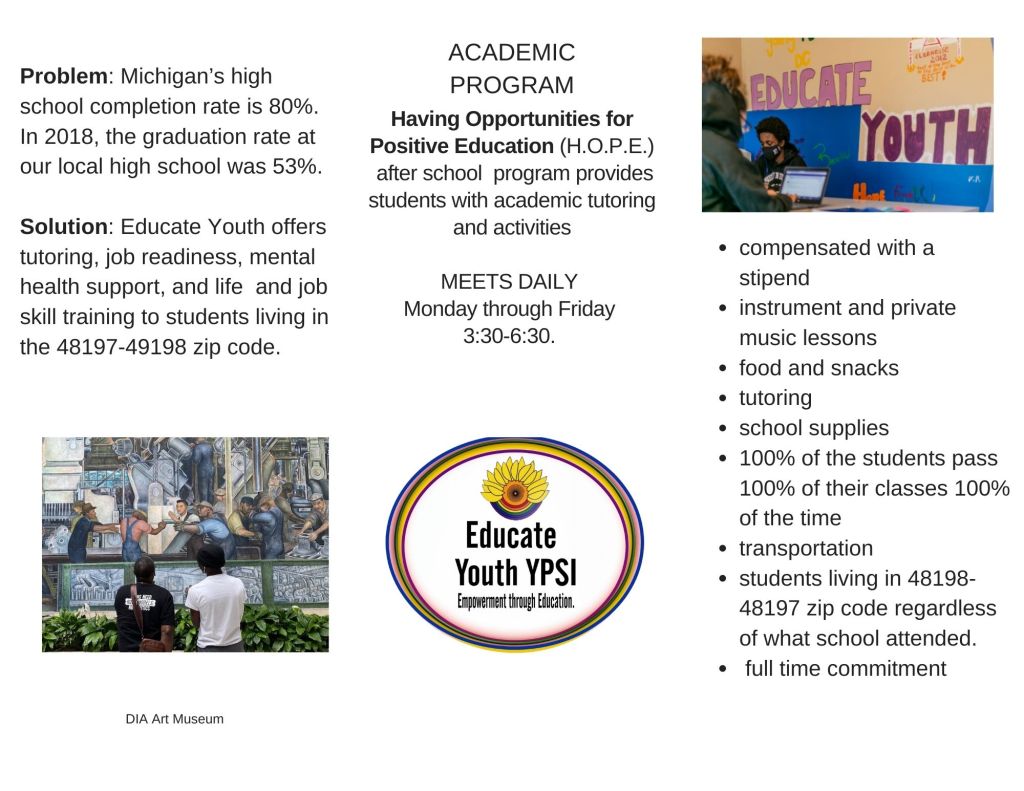 In the summer of 2013, Dedicated to Make a Change director Gail Wolkoff started looking for academic support and service learning programs for Ypsilanti youth. She found that academic programs for adolescents were virtually nonexistent. In order to fill that gap, Gail and Angela Stanley designed the HOPE Summer Program for youth ages 12-15. The program focused on providing individualized academic support for students with lots of one-on-one attention geared toward optimizing each student’s growth and success. Recognizing the need for continued support during the school year, Gail designed the H.O.P.E. Academic Program as a continuation of the HOPE Summer Program, focusing on the developmental and academic improvement of each participant. The program increases interest in learning