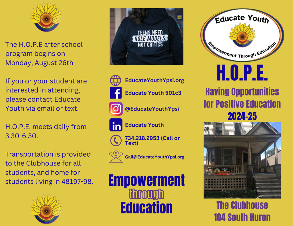The H.O.P.E. (Having Opportunities for Positive Education) after school program was designed as a response to the state of Michigan’s 84% high school graduation rate. Educate Youth’s solution? Providing tutoring, job readiness, mental health support, and life & job skill training to students living in the 48197-48198 zip code, regardless of what school they attend.
