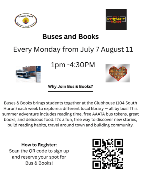 In partnership with Our Community Reads, Buses & Books runs every Monday from June 30 to August 11, 1:00 p.m. to 4:30 p.m. Students ride the city bus together to a different local library each week, explore a chosen book, and talk about it in small groups. Along the way they collect free AAATA bus tokens, new books to keep, and plenty of memories. The club turns reading into an adventure, strengthens public-transport skills, and builds a love of literature and neighborhood life.