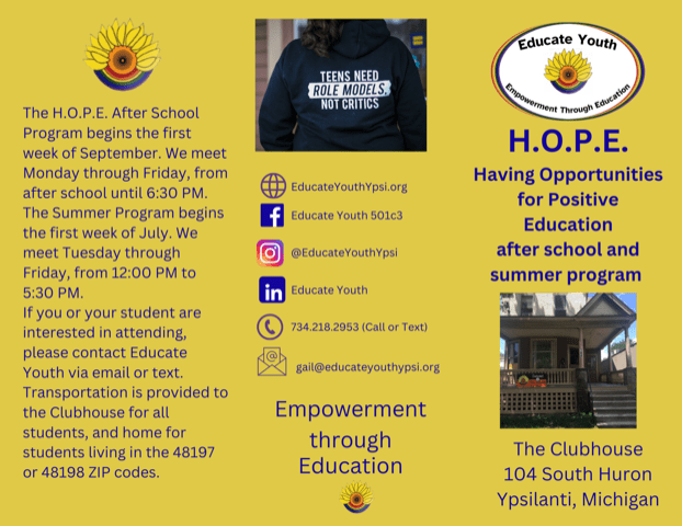 The H.O.P.E. After-School Program resumes the first week of September and meets Monday through Friday until 6:30 p.m. Transportation is provided to and from the Clubhouse for students living in the 48197 or 48198 ZIP codes. Families can phone, text, or email for details.