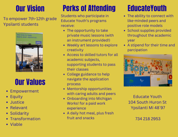 Educate Youth has offered free, safe summer programming for Ypsilanti teens since 2011, starting with a single week of academics and service work at the public library. Over the years that simple idea has grown into a multi-week season of study help, creativity, field trips, and community service—all designed to keep young people learning, connected, and inspired when school is out.